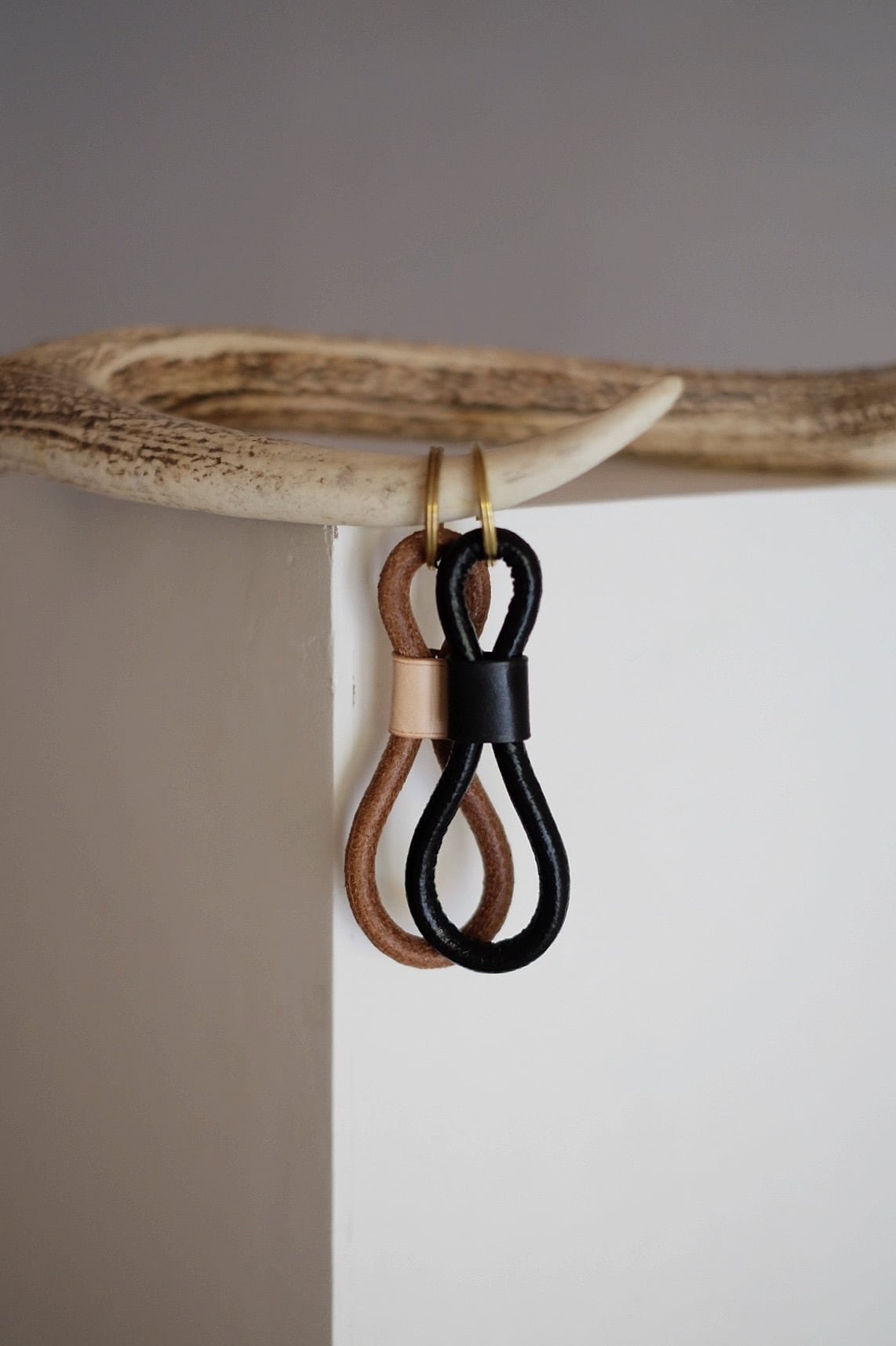 8の字型のロープキーホルダー。 存在感があるので、バッグの中で行方不明になったりしません。 太い牛革の丸紐を使用してあります。 size 約11cm (全て手縫いで仕上げているため、多少の個体差がありますことをご了承ください。)