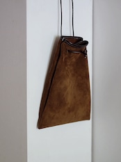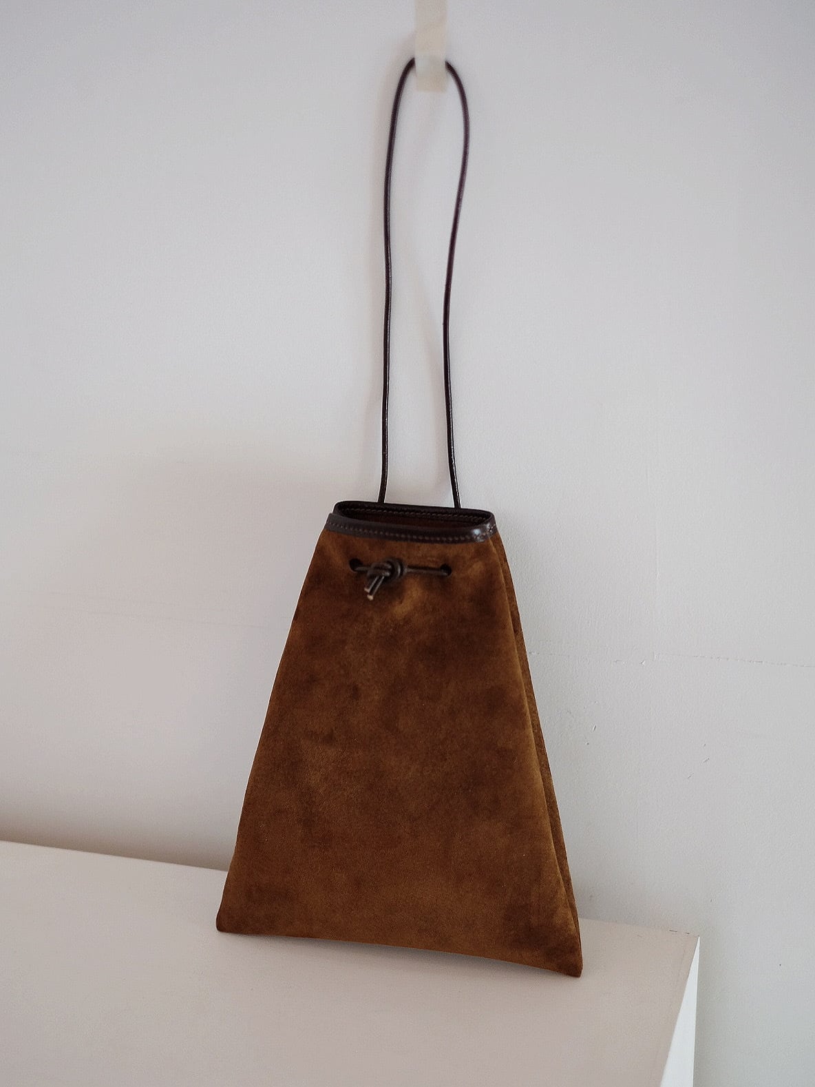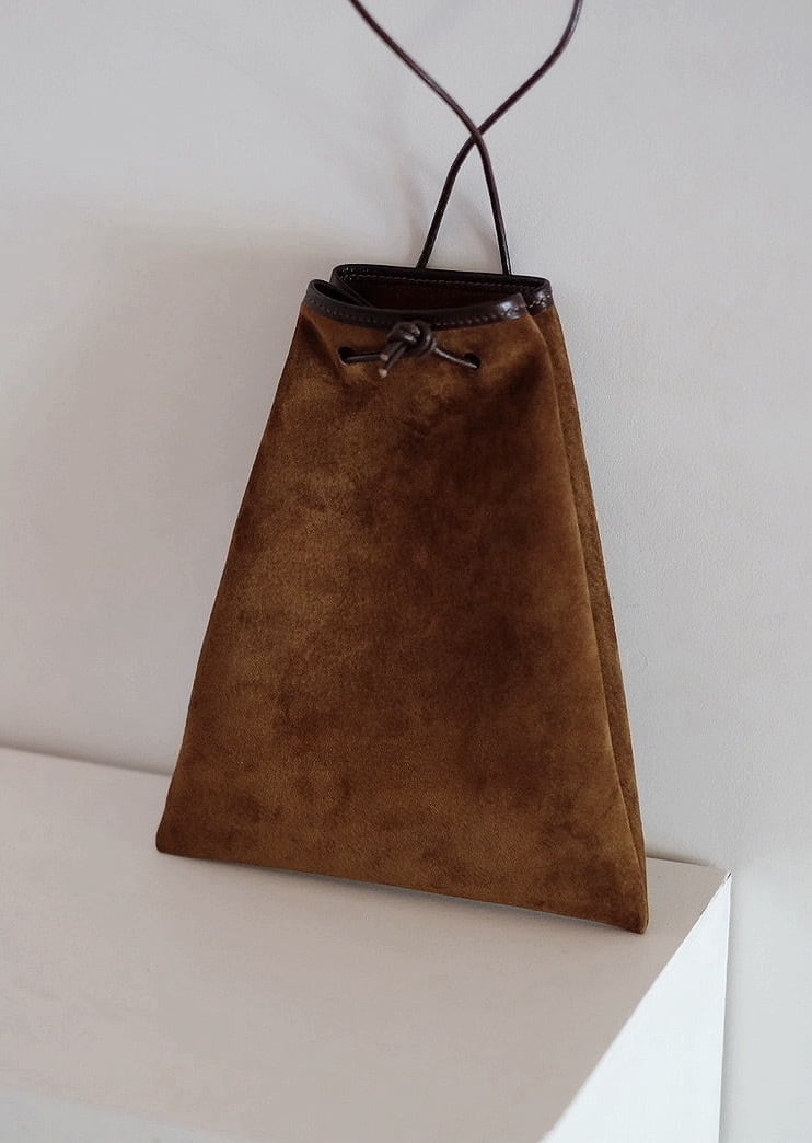 上質で厚手のピッグスウェードで作られたコンパクトな巾着バッグ。新しくブラウンカラーで制作しました。